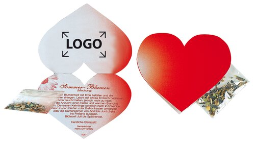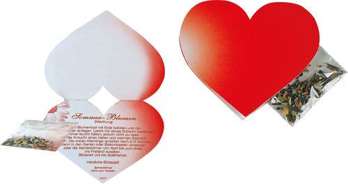 Ideales Giveaway und Mailingverstärker für jede Art von einer Botschaft mit "Herz". Das portofreundliche Format und eine bunte Blumenmischung machen aus diesem Artikel einen Hit. Nutzen Sie das Standardmotiv der Innenseite für Ihre Werbung. Druck in das Standardmotiv oder eine eigene Gestaltung der Karte, jeweils ab 500 Stück.