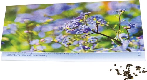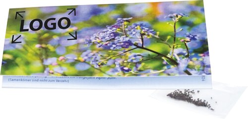 Die ideale Beilage für Ihre Werbebotschaft. Verschiedene Standardmotive und Samensorten stehen zur Auswahl. Mit dieser Karte haben Sie, mit Ihrer eigenen Gestaltung der Vorder- und Rückseite (außen), einen preiswerten Mailingbegleiter. Die Samentüte wird innen eingelegt und Sie können die Sorte der Samen, passend zu Ihrer Werbeaussage und Jahreszeit, selbst wählen. Der Druck erfolgt in das Standardmotiv oder eine eigene Gestaltung, jeweils ab 250 Stück. Samen: Vergissmeinnicht
