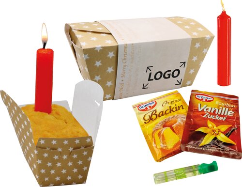 Mit den Zutaten und dem Rezept auf der Banderole fehlen nur noch Mehl, Zucker, Öl und milch und der kleine Zitronenkuchen kann direkt in der Papier-Backform gebacken werden. Die Banderole bietet viel Platz für Ihren Werbeeindruck im Standardmotiv oder auch für Ihre eigene Gestaltung ab 250 Stück.