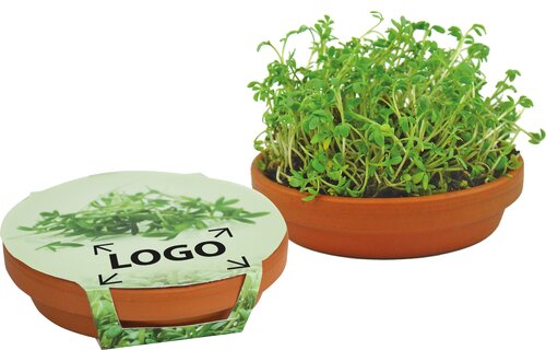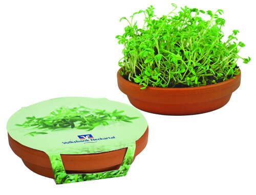 Überreichen Sie eine Schale voller Vitamine. Ganz einfach funktioniert das mit unserer Kresse-Schale. Die Kressesamen auf die gequollene Erdtablette legen, und nach vier bis fünf Tagen können die Vitamine geerntet werden. Der Werbegruß für einen schnellen Erfolg. Die Banderole bietet ausreichend Platz für Ihre Werbeanbringung. Eine individuelle Gestaltung ist ebenfalls bereits ab 250 Stück möglich.