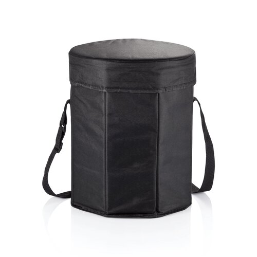 600D Polyester mit schwarzem Kunststoffüberzug, Durchmesser 30cm x Höhe 35cm, klappbar, als Kühlbox und Sitz zu gebrauchen.