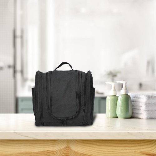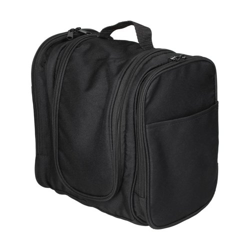 Schwarzer Kulturbeutel aus Polyester mit reichlich Platz. Der Kulturbeutel überzeugt mit einem großem Hauptfach, das fünf Netzfächern als auch ein oberes Netzfach mit Reißverschluss sowie Haken zum Aufhängen beinhaltet. Des Weiteren gibt es zwei weitere Außentaschen, die je ein weiteres Netzfach und integrierte Gummilaschen für z.B. Utensilien wie Zahnbürsten etc. enthalten. Der große Tragegriff am Kulturbeutel und die kleinen seitlichen Henkel, sorgen für einen angenehmen Tragekomfort.