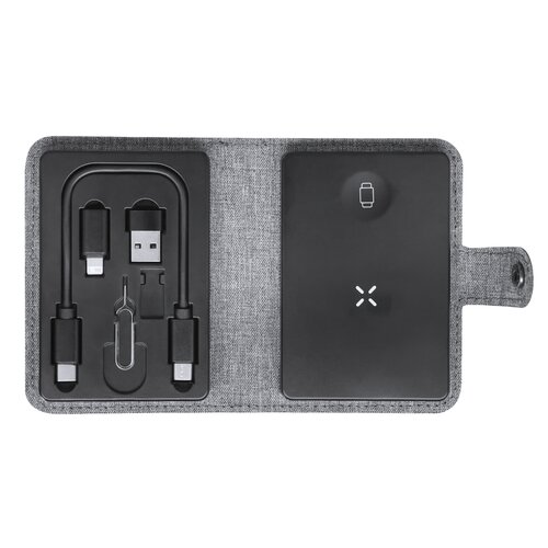 Komplette Ladestation aus 300D RPET. Kompaktes Gehäuse mit Druckknopfverschluss und inklusive Qi-Wireless-Ladestation für Smartphones, Kopfhörer und Smartwatches. Wird mit einem Typ-C-Verbindungskabel an beiden Enden geliefert, sowie USB- und Lightning/Micro-USB-Adaptern. Das Set wird durch einen SIM-Karten-Auswerfer und ein Fach zum Aufbewahren einer Micro-SIM-Karte vervollständigt. Mit RPET-Logo.RPET-Material besteht aus recyceltem Kunststoff, fördert somit die Wiederverwendung von Plastikabfällen und trägt zur Nachhaltigkeit des Planeten bei.