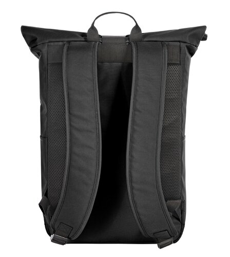 urbaner Überschlag-Rucksack; großes Hauptfach mit Reißverschluss und zusätzlicher Klettlasche; RPET-Obermaterial; gepolstertes Notebookfach und flaches Einsteckfach innen; große Reißverschluss-Vortasche auf der Front; zwei seitliche Einsteckfächer für z.B. Trinkflaschen; gepolstertes Tragesystem; Handgriff