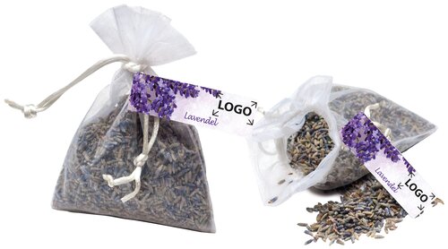 Die duftenden Lavendelblüten sind immer ein angenehmes Präsent zum Überreichen. Die qualitativ hochwertigen Blüten finden vielseitige Verwendung. Sie können in der Kosmetik eingesetzt werden oder dienen als Dufterfrischer an vielen Orten. Platz für den Werbedruck ist im Standardmotiv des Anhängekärtchens oder eine eigene Gestaltung des Kärtchens, jeweils ab 250 Stück.