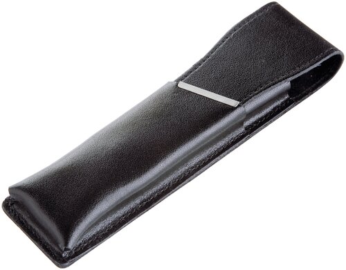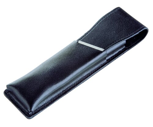 Schwarzes Lederetui für ein oder zwei Schreibgeräte mit silberfarbener Metallleiste.