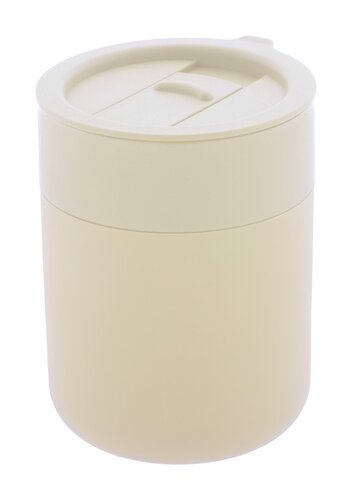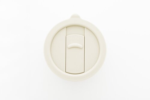 Reisebecher aus Keramik mit Silikonummantelung mit Trinkdeckel aus PP Kunststoff. Füllmenge: 300 ml.