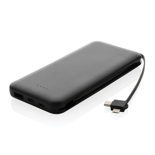 10.000mAh flache Powerbank mit integrierten Ladekabeln, bei der das Gehäuse aus RCS-zertifizierte recyceltem ABS-Kunststoff und die Kabel aus RCS-zertifiziert recyceltem TPE hergestellt sind. RCS (Recycled Claim Standard) ist ein Standard zur Überprüfung des Recyclinganteils eines Produkts über die gesamte Lieferkette hinweg. Recycelter Gesamtanteil: 20% basierend auf dem Gesamtgewicht des Artikels. Die Powerbank enthält einen langlebigen A-Grade Lithium-Polymer-Akku mit 10.000mAh. Die Energieanzeige zeigt den verbleibenden Energiestand an, so dass Sie immer wissen, wann Sie den Akku wieder aufladen müssen. Micro-USB-Input 5V/2A; Type-C-Input 5V/2,4A; USB-Output 5V/2A; Type-C-Output: 5V2.4A, iOS-Output: 5V/1A. Artikel und Zubehör PVC-frei. Inklusive PVC-freiem Type-C-Ladekabel aus recyceltem TPE-Material.