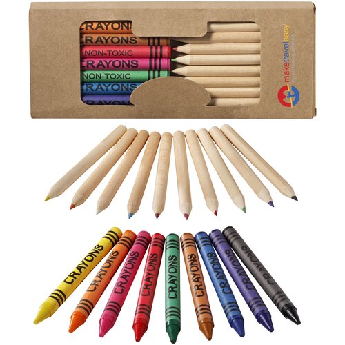 9 farbige Wachsmalstifte und 10 Buntstifte im Karton mit Kunststofffenster.