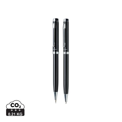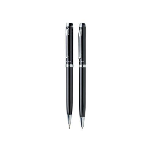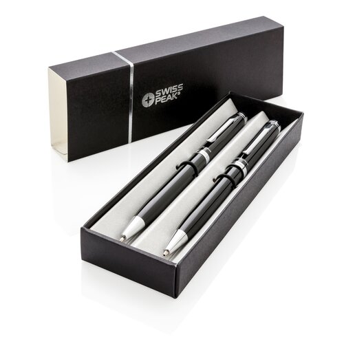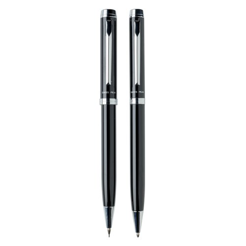 Elegantes Schreibset aus Kugelschreiber und Bleistift. 1200m blauschreibender, deutscher Tinte und der Bleistift mit 3 Minen von 0,7mm Stärke. Verpackt in Swiss Peak Geschenkbox.
