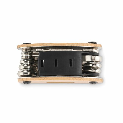 Multifunktionswerkzeug aus Edelstahl mit Dekor aus Bambus. 11 Funktionen: Sechskantschlüssel, Flachschlüssel, Verlängerung, Kreuzschlitzschraubendreher und Steckschlüssel.