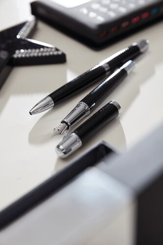 Schreibset MANZONI, 2-teilig: bestehend aus Kugelschreiber mit Drehmechanismus (schwarzschreibend) sowie Füllfederhalter mit Verschlusskappe mit Clip, inkl. 1 Tintenpatrone, beide Schreibgeräte mit Metall-Schaft, im Etui mit Aluminiumplatte