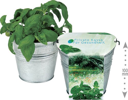 Das Zinkeimerchen, ca. 10,5 cm, enthält Tontopf, Erdtablette und Basilikum für eine vitaminreiche Botschaft. Platz für den Werbeaufdruck ist auf der Standardbanderole. Eine eigene Gestaltung der Banderole ist ebenfalls ab 250 Stück möglich.