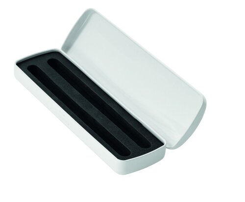 Metall-Klappetui für ein oder zwei Schreibgeräte mit lackierter Oberfläche in schwarz oder weiß.