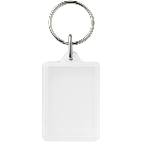 Transparenter, rechteckiger Y1-Schlüsselanhänger mit metallenem Schlüsselring. Der Metallring bietet ein flaches Profil, das sich ideal für Mailings eignet. Abmessungen der Druckeinlage: 3,5 cm x 2,4 cm.