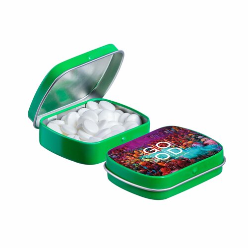 Kleine Klappdeckeldose Pfefferminz als Werbeartikel weiß