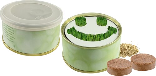 Ein grünes Lachgesicht aus der Dose. Schon nach wenigen Tagen sprießt das Gras und kann bald zurückgeschnitten werden, um die Kontur sichtbar zu halten. Die Banderole bietet viel Platz für Ihre Werbebotschaft oder, ebenfalls ab 250 Stück, für Ihre individuelle Gestaltung.