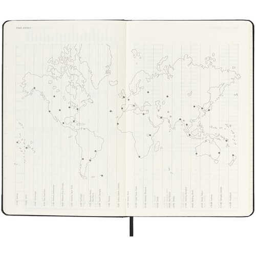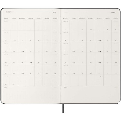 Der von Januar bis Dezember 2026 datierte Moleskine Hardcover Wochenplaner für 12 Monate zeigt die ganze Woche auf einen Blick, bietet aber auch Jahres- und Monatsübersichtsseiten für einen breiteren Jahresüberblick, gefolgt von Seiten für Reiseplanung, Ideen und Ziele. Auf der einen Seite sind die Wochentage dargestellt, gegenüber befindet sich eine linierte Seite, auf der Aufgaben und Notizen eingetragen werden können. Er enthält elfenbeinfarbenes, säurefreies Papier, einen schwarzen, elastischen Verschluss, ein Seitenband, eine farblich abgestimmte, erweiterbare Innentasche und Aufkleber zur persönlichen Gestaltung sowie Jahresaufkleber für den Buchrücken.