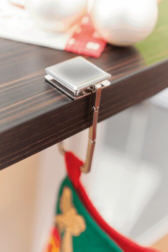 Handtaschen-Halter MONTREUX, ausklappbar: Oberseite aus Edelstahl für Werbeanbringung, gummierte Unterseite sorgt für sicheren Halt auf glatten Oberflächen