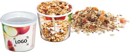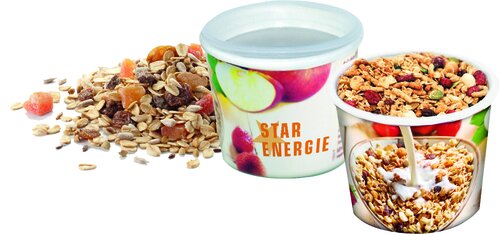 Fit in den Tag starten. Eine kleine Portion Fitness bietet unser Müsli 2Go. Die umlaufende Banderole bietet viel Platz für Ihre Werbeaussage. Eine eigene Gestaltung der Banderole ist ebenfalls ab 250 Stück möglich.
