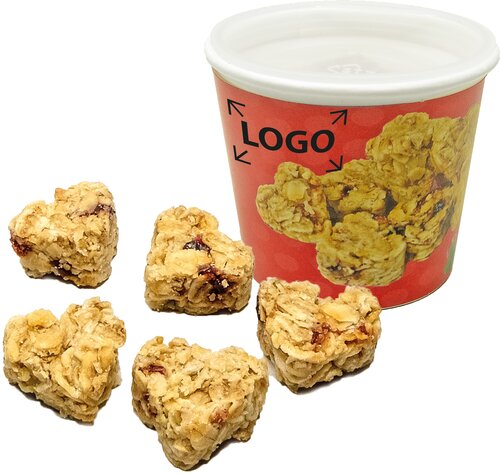 Die Müsli-Herzen sind gesund und lecker und eine schöne Abwechslung im Müsli-Alltag. Nutzen Sie das Standardmotiv der Banderole für Ihren Werbeeindruck. Eine individuelle Gestaltung ist ebenso ab 250 Stück möglich.