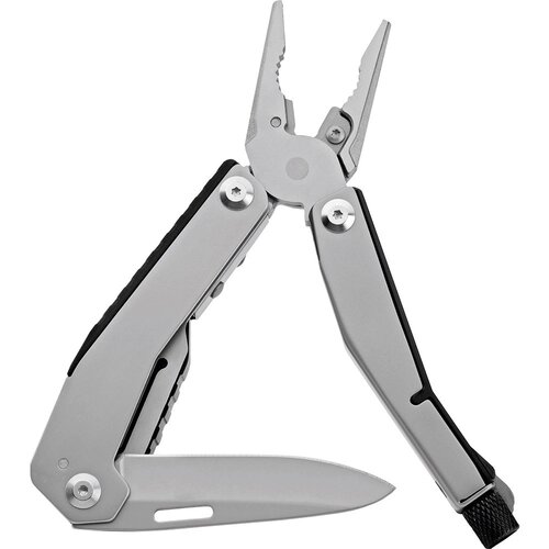 Multifunktions-Werkzeug mit 8 Funktionen. Extrem hochwertiges Multi-Werkzeug aus Edelstahl 420 sandgestrahlt. Als Besonderheit verfügt der Griff über zwei Steckplätze für den abnehmbaren magnetischen Bithalter. Indem eine Griffseite ausgeklappt wird, kann es als Schraubendreher mit langem Griff eingesetzt werden. Im zusammengefalteten Zustand und dem Steckplatz an der Seite des Griffes kommt das Tool als L-Griff-Schraubendreher für höhere Drehmomente zum Einsatz. Material: Multi-Tool und Zangenkopf aus Edelstahl 420 sandgestrahlt, Messer aus Edelstahl 440A, Einlagen für Griffschalen aus ABS, Cr-V Bits. Werkzeuge: Spitzzange, normale Zange, Schneidzange, Drahtschneider, Messer (Klingenlänge 71 mm), abnehmbarer magnetischer Bithalter, Bit für Phillips-Schrauben (PH2), Bit für Schlitzschrauben (5,0). Funktionen: Messer arretierbar und Schraubendreher kann im geschlossenen Zustand des Multi-Tools ausgeklappt und eingesetzt verwendet werden, magnetischer Bithalter mit ¼" (6,35 mm) Sechskantschaft, Gürtelclip. Zubehör: Nylon-Gürteltasche. Verpackung: schwarze Geschenkverpackung.