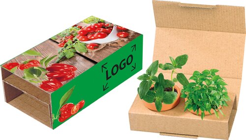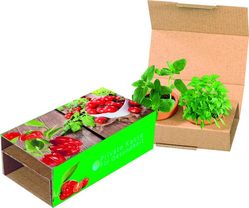 Zwei Gemüsesorten, die zum gesunden Naschen einladen. Cocktailtomate und Paprika. Ein gelungenes Duo für wachsende Partnerschaften. Auf dem Standardmotiv der Banderole ist ausreichend Platz für Ihren Werbeeindruck. Auch eine eigene Gestaltung der Banderole ist ab 250 Stück möglich.