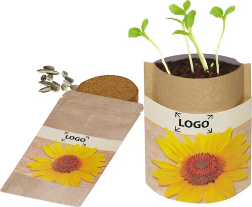 Natur-Bag, der kleine Garten aus der Tüte. Öffnen, Erdtablette quellen lassen und das Saatgut einsäen. Die Naturtüte fängt durch die Innenkaschierung die Feuchtigkeit auf. Die umlaufende Banderole ist während der Wachstumsphase stets im Blickfeld. Werbeaufdruck auf dem Standardmotiv oder eine eigene Gestaltung ab 250 Stück.