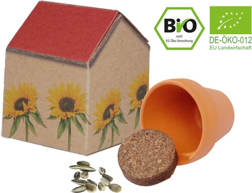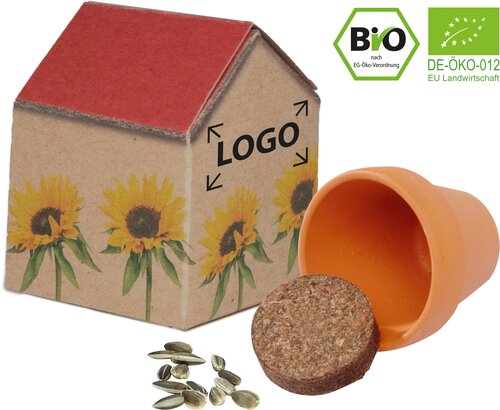 Ein Natur-Häuschen für Ihre Werbebotschaft. Natürliche Rohstoffe, wie Naturpapier, Tontopf und Bio-Samen lassen ein gelungenes natürliches Giveaway entstehen. Das Häuschen kann mit Ihrem Eindruck versehen werden oder, ebenfalls ab 250 Stück, individuell gestaltet werden.