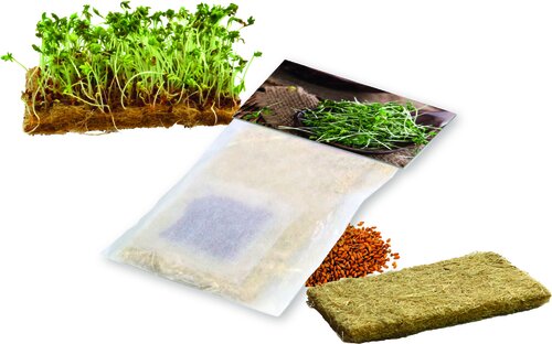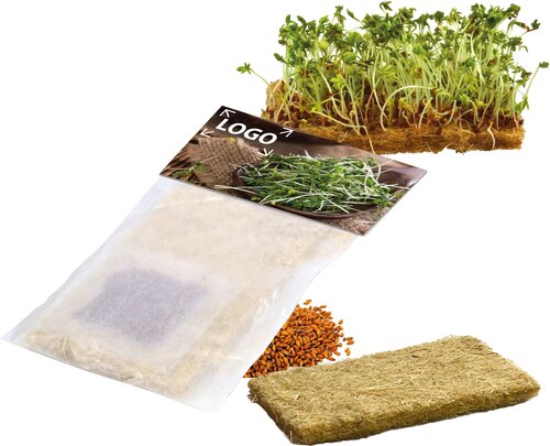 Die natürlichen unbehandelten Hanffasern kommen hier als Wachstumsvlies zum Einsatz. Es wird keine Erde benötigt. Einfach die Kressesamen auf das angefeuchtete Vlies streuen und wachsen lassen. Im Pergaminbeutel sind das Naturvlies und die Samentüte ansprechend verpackt. Ihr Werbeeindruck in das Standardmotiv oder eine individuelle Gestaltung des Headers ist jeweils bereits ab 250 Stück möglich.