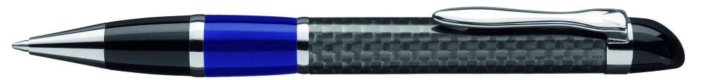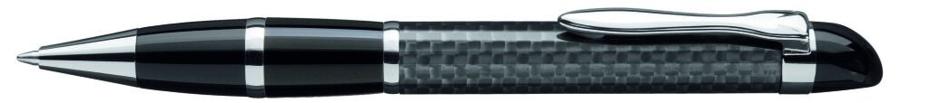 Edler Carbonfaser Metalldrehkugelschreiber mit farbiger Griffzone, flexiblem Metallclip, Metallzierring und Metallspitze glanzverchromt.