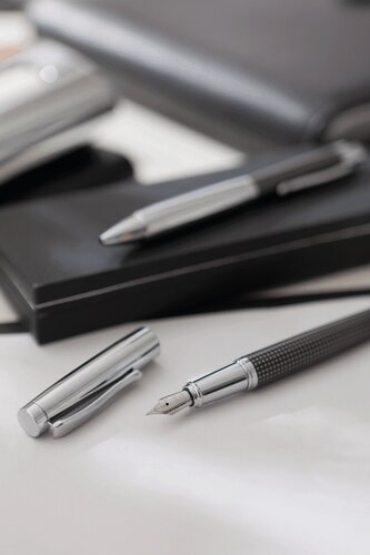 Edles Schreibset NOBLESSE, 2-teilig: bestehend aus Kugelschreiber mit Druckmechanismus (blauschreibend) sowie Füllfederhalter mit Verschlusskappe mit Clip, inkl. 1 Tintenpatrone, beide Schreibgeräte mit Metall-Schaft und kariertem Dekor, im Etui