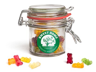 Nostalgie Glas gefüllt mit Fruchtgummi inkl. Etikett transparent