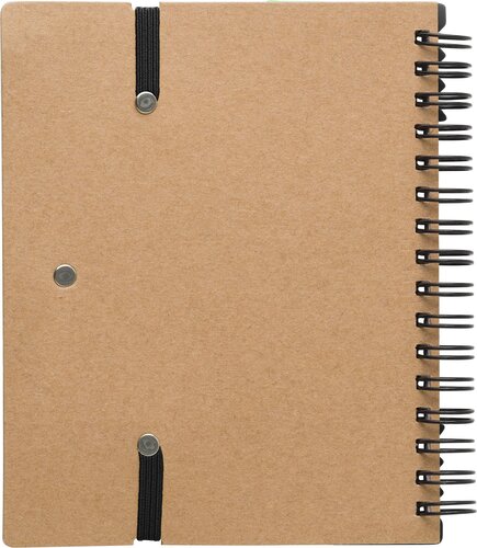 Notizbuch aus recyceltem Papier mit Ringbindung und 60 linierten Seiten. Haftnotizen in 5 Farben, Lineal und einem Rollerball.