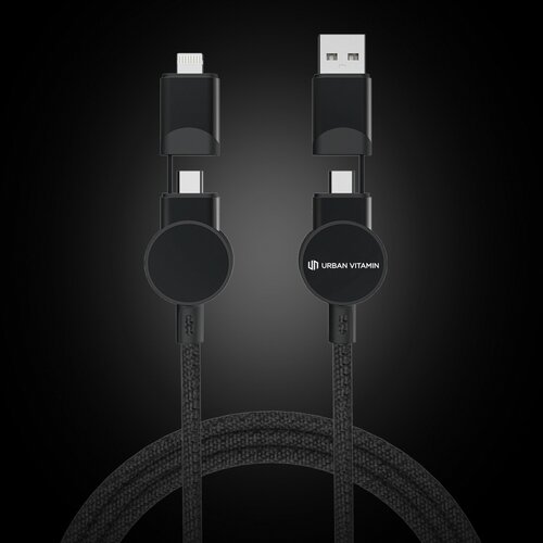 Das Gehäuse des Schnellladekabels Oakland besteht aus 100% RCS-zertifiziert recyceltem TPE & Aluminium, das Kabel aus 100% recyceltem TPE-Innen und 100% recycelter PET-Außenschicht. RCS (Recycled Claim Standard) ist ein Standard zur Überprüfung des Recyclinganteils eines Produkts in der gesamten Lieferkette. Dieser Standard wird verwendet, wenn ein Teil des Artikels aus recycelten Materialien hergestellt wurde. 120cm langes Kabel mit 5 verschiedenen Anschlüssen: USB-C In,USB-A In,Typ-C Out,IOS Out und Micro USB Out. Daher auch mit Typ-C Ausgabegeräten verwendbar, wie z.B. neueren Generation von Telefonen und MacBook-Computern. Die USB-A-In/Out-Option sorgt dafür, dass man jedes Gerät von jeder Ausgangsquelle aufladen kann. Maximale Spannung von Typ-C zu Typ-C sind 45W. Urban Vitamin Artikel werden ohne PVC hergestellt. Die Verpackung mit besonders wenig Kunststoff verpackt. Gesamter Recyclinganteil: 52% bezogen auf das Gesamtgewicht des Artikels. Kann Laden und Synchronisieren.