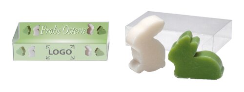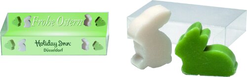 Überraschen Sie Ihre Kunden zu Ostern mit diesen hochwertigen Schafmilchseifen in Hasenform. Die natürlichen Zutaten Schafwollfett und Schafmilch sind eine Wohltat für die empfindliche Haut. Im Standardmotiv auf dem Einleger kann Ihr Werbeeindruck ab 250 Stück erfolgen. Eine individuelle Gestaltung ist ebenfalls ab 250 Stück möglich.