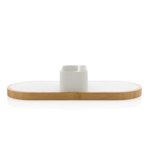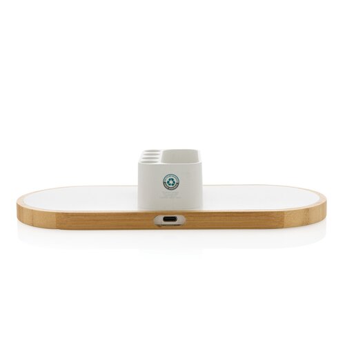 Schneller 10W-Dual-Wireless-Charger mit Stifthalter aus RCS-zertifiziert (Recycled Claim Standard) recyceltem ABS. Gesamter Recyclinganteil: 31% basierend auf dem Gesamtgewicht des Artikels. Die RCS-Zertifizierung gewährleistet eine vollständig zertifizierte Lieferkette der recycelten Materialien. Die Basis besteht aus 100% FSC®Bambus. Kabelloses Laden ist kompatibel mit Android der neuesten Generation, iPhone 8 und höher. Kann zwei Telefone gleichzeitig oder jedes andere QI-fähige Gerät aufladen. Mit 4 Stiftlöchern zum Aufbewahren von Stiften sowie einer kleiner Ablage für z.B. Visitenkarten oder andere kleine Gegenstände. Artikel und Zubehör PVC-frei. Inklusive 120cm Type-C Kabel aus RCS-zertifiziertem Recycling-TPE. Verpackt in FSC®Mix Kraftkarton. Type-C Input: 5V/2A; 9V/2A; Wireless Output: 5V/1A; 9V/1,1A; (10W) Registered Design®