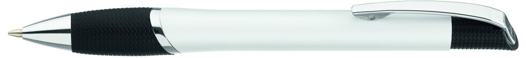 Metall-Druckkugelschreiber mit glänzendem Gehäuse, schwarzer Gummigriffzone und glanzverchromten Beschlagteilen.