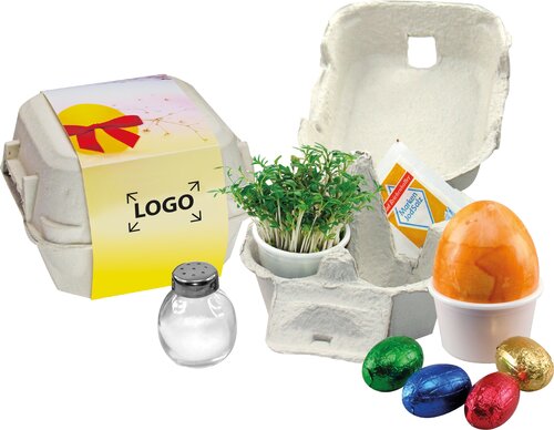 Osterfrühstück in der Eierschachtel als Präsent. Die 4er Box mit vier Schokoladeneiern, gesunder Frühstückskresse zum Ansäen und dann das schon gekochte Osterei mit der Prise Salz. Die besondere Osterüberraschung. Die Banderole bietet Platz für Ihren Werbeeindruck auf dem Standardmotiv oder die eigene Gestaltung ab 250 Stück.