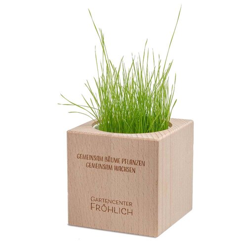 Viel mehr Werbefläche für noch bessere Marken- oder Produktwerbung des Unternehmens bietet das Pflanz-Holz Grande auf seiner umlaufenden Banderole aus Papier. Auf sagenhaften 32 x 7,5 cm kann individuell und hochwertig gedruckt werden. Und auch das bewährte Pflanz-Holz selbst bietet auf 5,5 x 5,5 cm auf allen vier Seiten eine echt „grande“ Gravurfläche beispielsweise für Firmenlogo und Co.. In dem Pflanz-Holz befindet sich ein Becher aus Papier, um das Holz vor auslaufendem Wasser zu schützen. Mitgeliefert wird eine Substrattablette als Erde und eine Samensorte nach Wahl. Ein Produkt-Highlight mit großem Werbeeffekt!