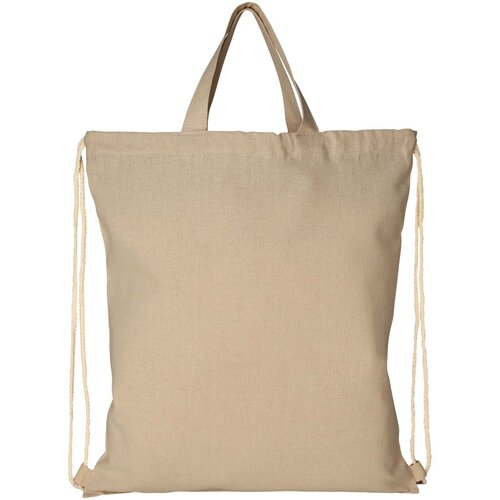 Rucksack aus 210 g/m² recycelter Baumwolle und recyceltem Polyester. Recycelte Baumwolle wird aus Verbrauchsabfällen hergestellt, die während des Schneidevorgangs in Textilfabriken anfallen. Großes Hauptfach mit Kordelzugverschluss aus Baumwolle. Ausgestattet mit zwei Griffen mit einer Höhe von 14 cm. Beständigkeit bis zu 5 kg Gewicht. Aufgrund des Produktionsprozesses kann es zu geringfügigen Farbabweichungen des Produktes kommen.