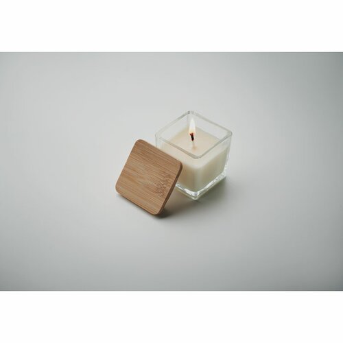 Kerze im rechteckigen Glas mit Deckel aus Bambus. Wachs auf pflanzlicher Basis. Unterschiedliche Düfte. 50 g. Brenndauer: 8 Stunden.