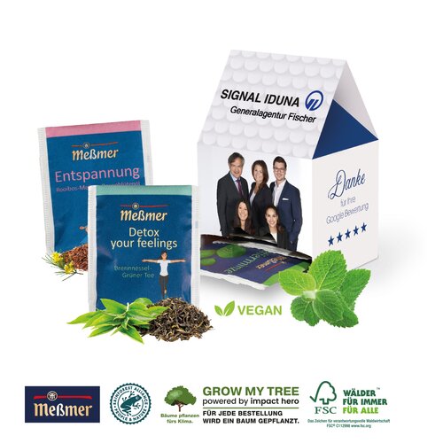 It´s Teatime! Die Mischung aus ausgewählten Spitzen-Tees aus dem Hause Meßmer verwöhnt auch anspruchsvolle Teefreunde und Teefreundinnen. 10 Beutel verbergen sich im attraktiven Tee-Haus. Starten Sie Ihre werbestarke Teatime. Inhalt: