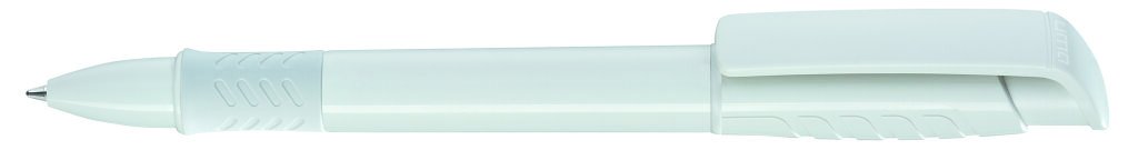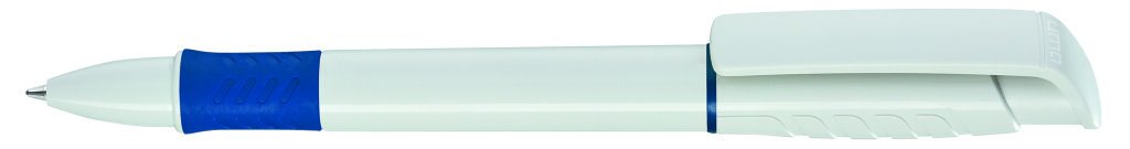Druckkugelschreiber mit gedeckt glänzendem Gehäuse in weiß, Griffzone und Zierring farbig oder unifarben gedeckt glänzend schwarz.