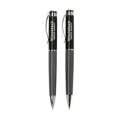 Hochglanz-Schreibset: blauschreibender Kugelschreiber mit Dreh-Klicksystem und einem Bleistift mit 3 HB-Minen (0,9 mm). Beide mit Metallakzenten. In einer Kassette.