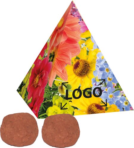 Die zwei Tonkugeln mit Samenfüllung Bunte Blumenmischung garantieren Spitzenwachstum. Einfach auf Blumenerde legen und wässern. Eine eigene Gestaltung der Pyramide ist ebenfalls ab 250 Stück möglich.