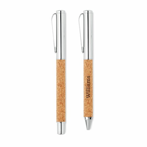 Schreibset aus Metall mit Drehkugelschreiber (blaue Tinte) und Rollerball (schwarze Tinte) mit Schaft aus Kork. Lieferung in passender Schachtel aus Kork. Kork ist ein natürliches Material, aufgrund seiner strukturellen Beschaffenheit und Oberflächenporosität kann das Druckergebnis pro Artikel Abweichungen aufweisen.