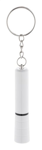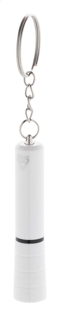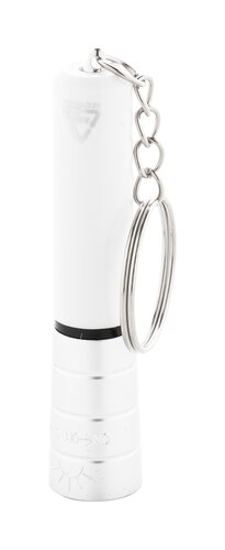 Mini-Taschenlampe aus recyceltem ABS-Kunststoff mit 1 LED, eleganter Metallic-Oberfläche und Metallschlüsselring. Inkl. Knopfzellenbatterie.
