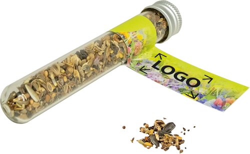 Bereiten Sie den Bienen einen gedeckten Tisch mit dieser ausgesuchten bienenfreundlichen Samenmischung. Das Reagenzglas kann anschließend für die Aufbewahrung von Kräutern oder Salz in der Küche dienen. Das Fähnchen bietet im Standardmotiv Platz für Ihren Werbeeindruck oder, ebenfalls ab 250 Stück, für Ihre individuelle Gestaltung.