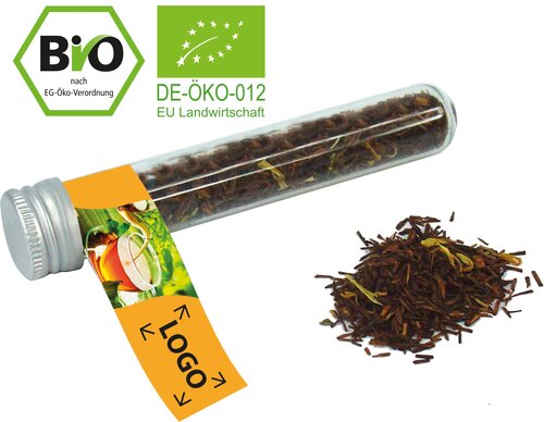 Die harmonisch abgestimmte Rooibusch Bio-Tee-Mischung im Reagenzglas reicht für zwei Tassen schmackhaften Tee. Der Werbedruck erfolgt auf dem Standardmotiv oder eine eigene Gestaltung des Fähnchens, jeweils bereits ab 250 Stück möglich. Zertifikat: Bio Siegel EU